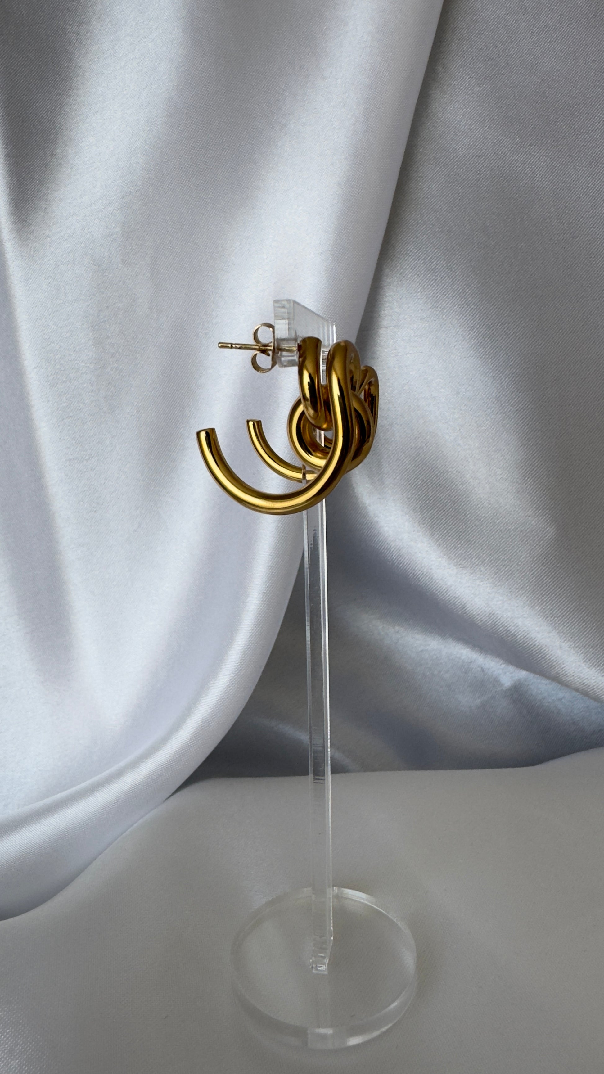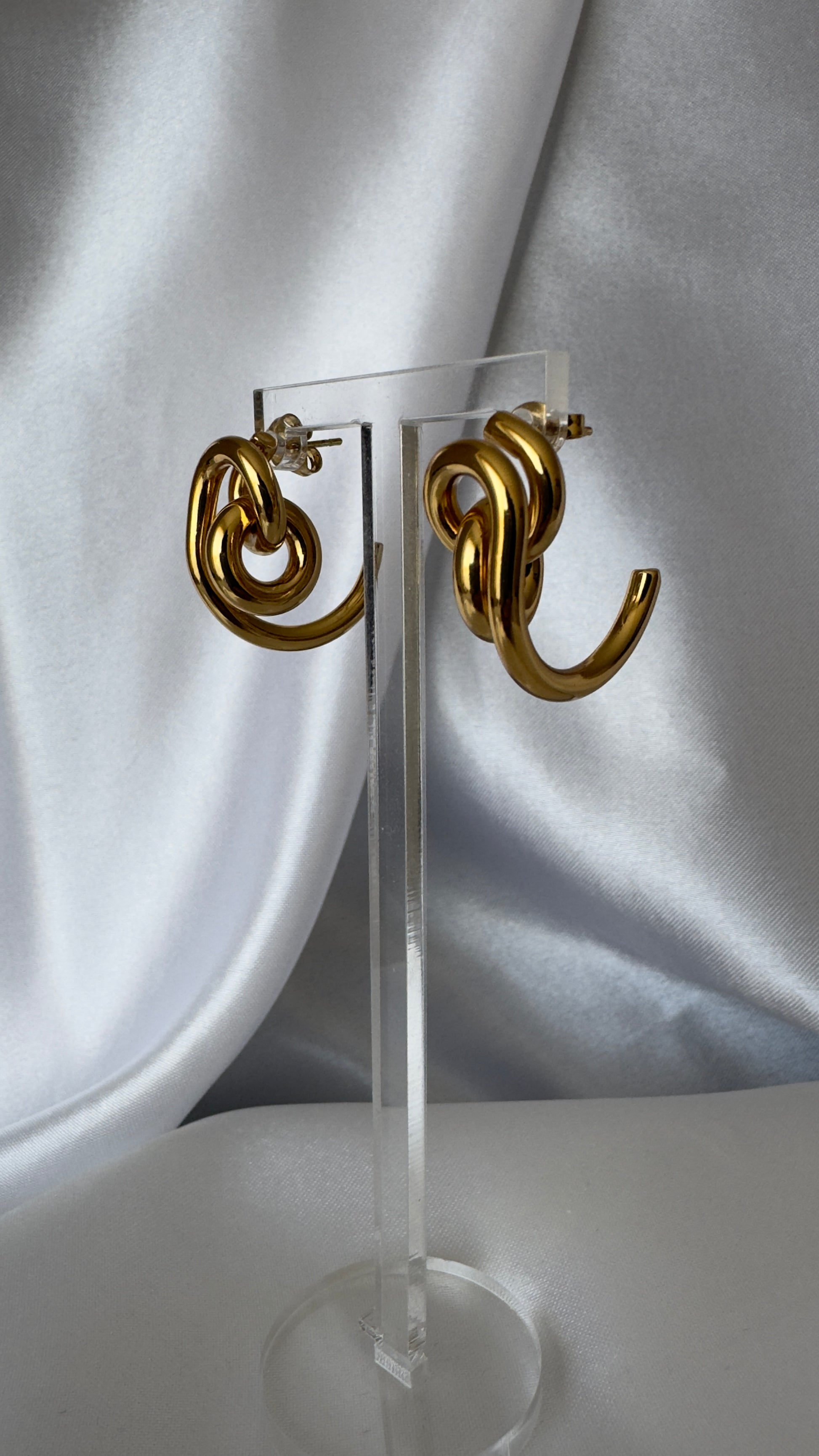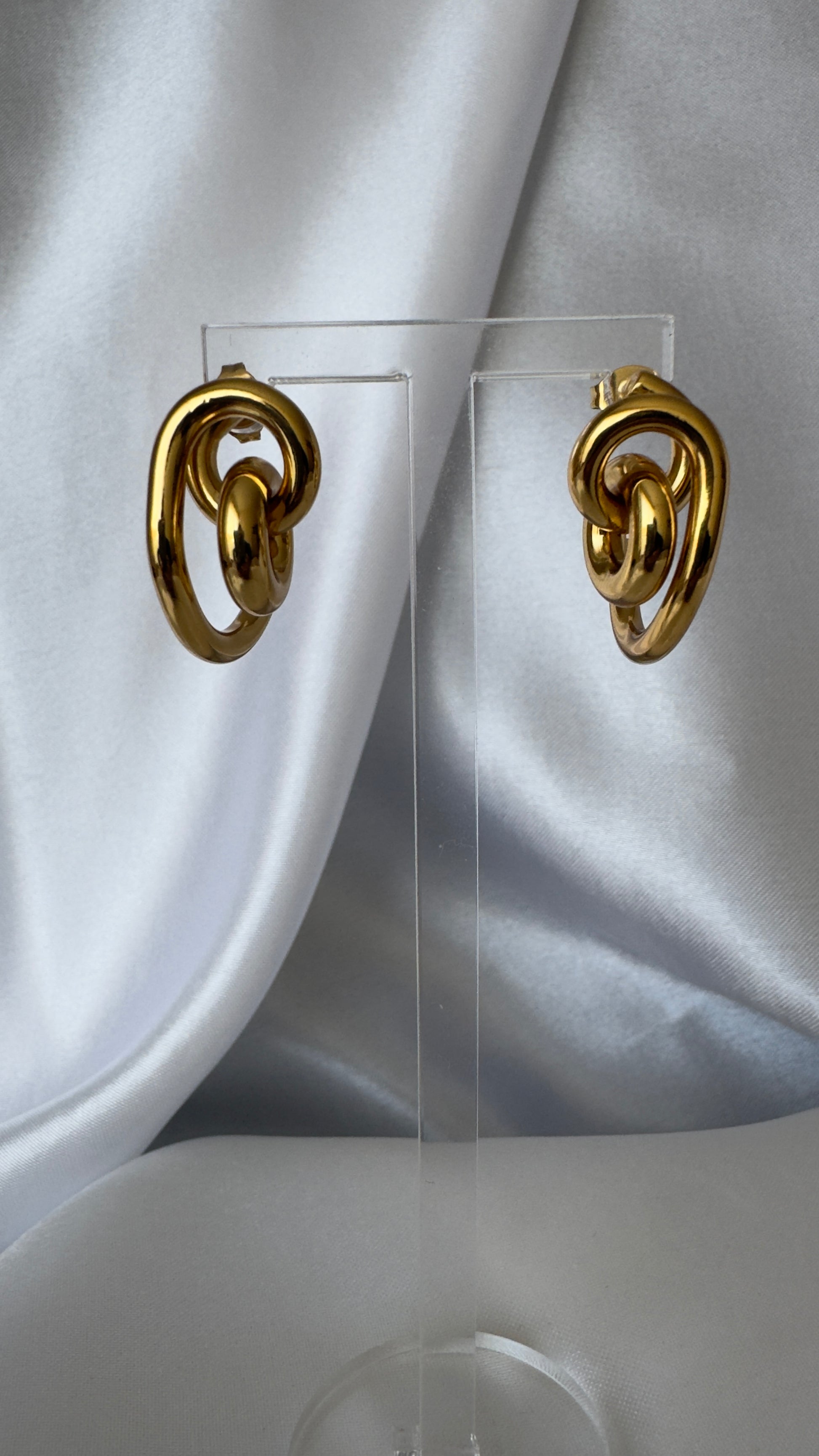 Brinco dourado com design de elos entrelaçados e acabamento polido. Uma peça marcante, moderna e atemporal, ideal para mulheres que gostam de presença e sofisticação sem excessos.